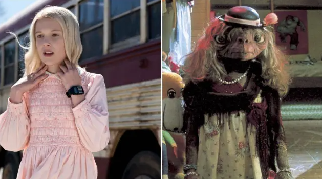 En la primera temporada, cuando Eleven se pone la peluca rubia y el vestido rosa, es un homenaje visual directo a E.T. El Extraterrestre, cuando visten al alienígena para disfrazarlo. Además, Eleven es fan de los Eggos (waffles) porque es la primera comida que roba, similar a cómo E.T. descubre la comida humana.