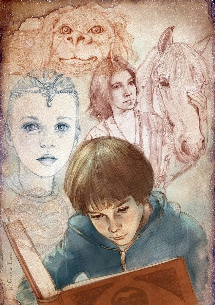 - Atreyu: El protagonista del mundo de Fantasía. Es un joven guerrero de la gente piel-verde (los cazadores de llanuras). Es valiente, noble y se le encarga la Gran Búsqueda de un remedio para la Emperatriz Infantil.