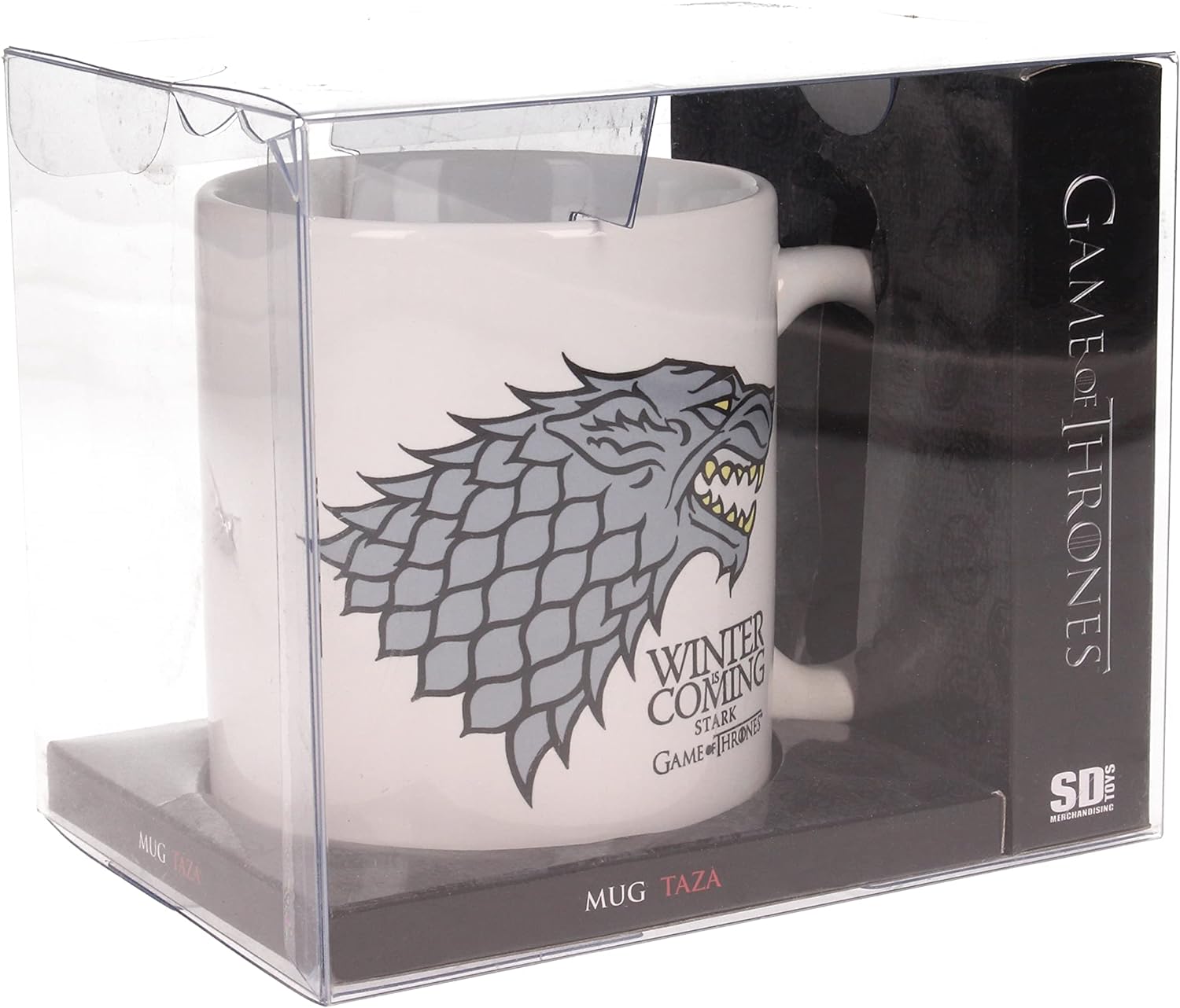 Taza de cerámica ilustrada con la imagen del escudo y el lema de la Casa Stark. Admite lavavajillas y microondas. Presentada en caja de pvc transparente. Para los fans de game of thrones.