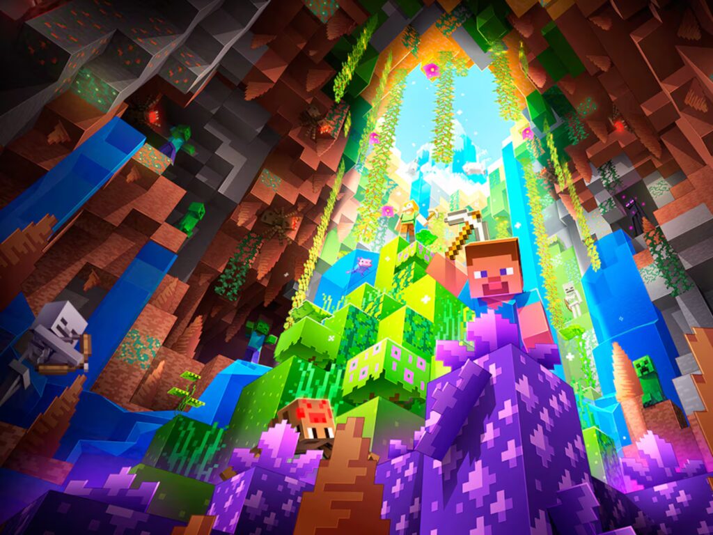 Minecraft es un videojuego de construcción, aventura y supervivencia en un mundo abierto formado por bloques. El jugador puede explorar, recolectar recursos, crear herramientas, construir estructuras y enfrentarse a criaturas hostiles durante la noche. El juego ofrece varios modos como Supervivencia, Creativo y Aventura, además de mundos infinitos generados proceduralmente que permiten una experiencia totalmente única en cada partida.