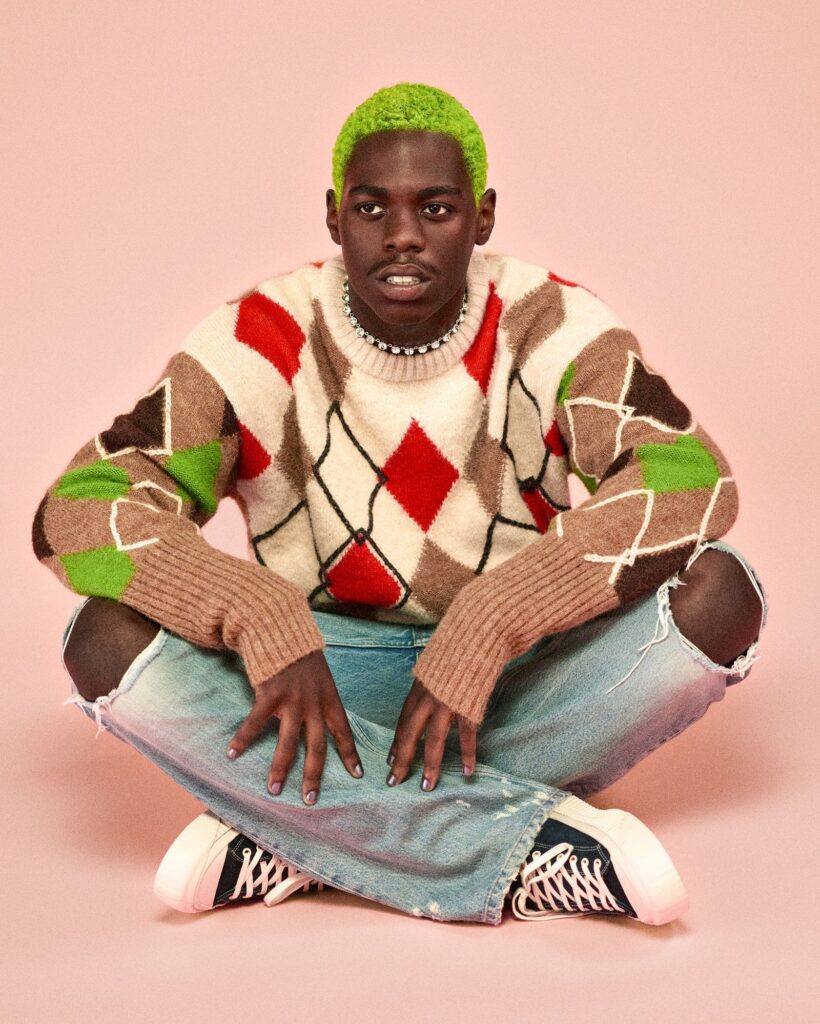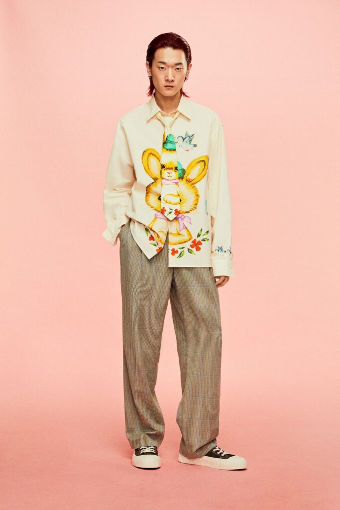 Harry Lambert se inspiró en sus propias experiencias coleccionando ropa vintage y en ilustraciones de cromos antiguos de su infancia. Las prendas incluyen chaquetas con cremallera tipo retro, abrigos duffle con forro de piel sintética y jerseys de punto con intarsia que muestran pequeños personajes “cuties”. La colección juega con las proporciones, utilizando cortes oversize y puños y bajos alargados, creando un estilo llamativo y desenfadado.
