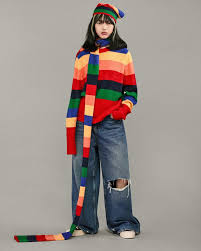 La línea de accesorios incluye collares de cristales, bolsos tipo bandolera con el logo “Cutie Chaos”, bolsos ilustrados tipo “carry-all” y bufandas largas pensadas para combinar con los jerseys. También se incluyen zapatillas con plataforma en distintos colores y estampados, manteniendo la estética lúdica de la colección.